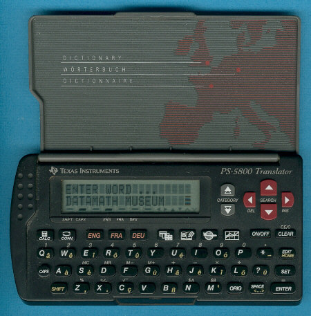 Texas Instruments introduced a very powerful Translator in a housing similar to the PS-3600 Databank.The internal memory stores about 10,000 words, 420 business words and 920 complete sentences in 13 different categories. By simply choosing a word or sentence in one of the three languages the other two languages could be displayed.