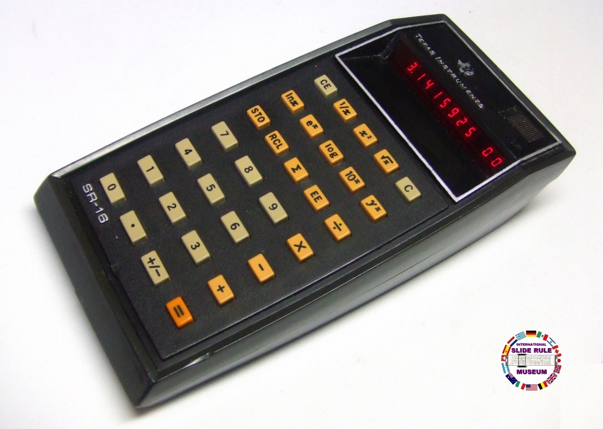 The SR-16 Slide Rule Calculator, used the packaging size of the SR-10 but had extra keys for doing logarithims and fractional exponents, but no trig functions. Its novelty was quickly outmoded when the SR-50 was released 3 months later.