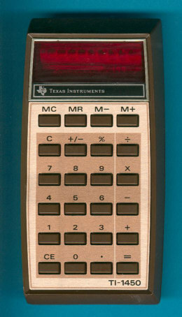 The TI-1450 differed slightly from the TI-1250 introduced roughly one year earlier. The brown housing together with the valuable keyplate desing made this calculator desirable for the manager desk. its interface had 8 digits and 6 functions. it runs on a 9v battery or a plug its numbers are illuminated by red LED's (light emitting diode). and is based on U.S. patent 3819921.