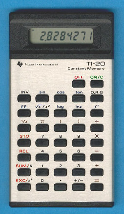 The Texas Instruments TI-20 is a scientific calculator with 8 digits precision and algebraic logic. It has 28 functions, 37 keys and an LCD (liquid crystal) display. The power source is 2xLR44. The calculator was manufactured in Italy.