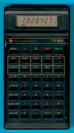 The Texas Instruments TI-25 is a scientific calculator with 8 digits precision and algebraic logic. It has 35 functions, 40 keys and an LCD (liquid crystal) display. The power source is 2xLR44. The calculator was manufactured in Japan.