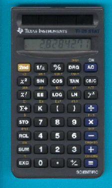 The Texas Instruments TI-25 STAT is a scientific calculator with 8 digits precision and algebraic logic. It has 43 functions, 40 keys and an LCD (liquid crystal) display. The power source is Solar. The calculator was manufactured in USA.