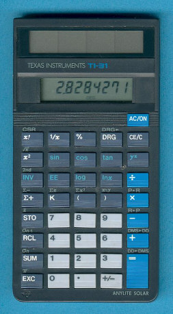 The Texas Instruments TI-31 is a finance calculator with 8 digits precision and algebraic logic. It has 33 functions, 40 keys and an LED (light-emitting diode) display, typical of calculators of this era. The power source is PP3 9V. The calculator was manufactured in Italy.