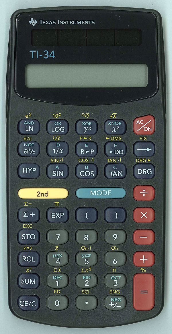 The TI-34 was one of the higher sophisticated calculators sold by Texas Instruments in the year 1987. Compared with the TI-36 Solar some statistical functions were removed and logical operations added.