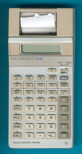 The TI-45 Micro Scientific Printer was one of the nice applications of the miniaturized printing technologies introduced with the TI-5000. The calculating capabilities are similar to the TI-30 SLR, manufactured by Toshiba, too. A similar product was launched with the BA-45 Micro Business Manager.