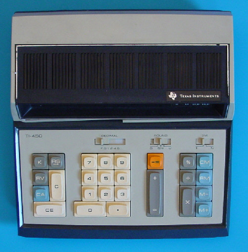 This rare TI-450 was introduced in the year 1973 soon after the TI-3500. The main limitation in daily use of the TI-3500 was the lack of a memory. The TI-450 used instead of the modern "calculator-on-a-chip" invented already in the year 1971 a two-chip solution. The TMS02xx/TMS03xx family gives both enhanced driving capabilities for 12-digit displays and enhanced memory for program and data.