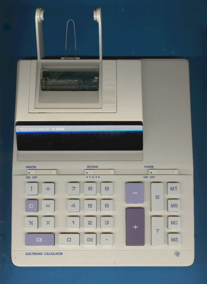 This TI-5030 followed the TI-5032, the first battery operated desktop printers sold by Texas Instruments. The housing and internal construction of the TI-5032 was used with a complete line of very similiar calculators.