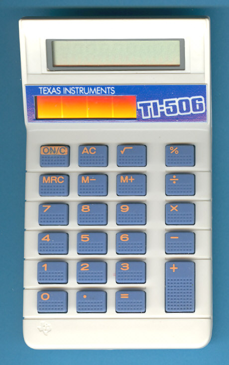 The TI-506 was one of the very cheap calculator sold by Texas Instruments. A small, slanted housing, rubber keys and solar cells enhanced by a colourful type designation.