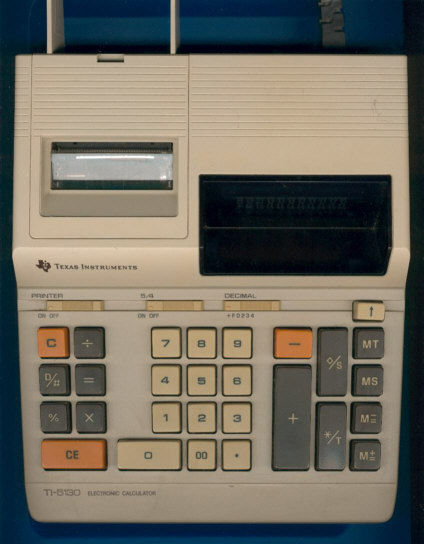 The Texas Instruments TI-5130 is an arithmetic calculator with 10 digits precision and algebraic logic. It has 6 functions, 28 keys and a VFD (vacuum fluorescent) display. The power source is Mains. The calculator was manufactured in Japan.