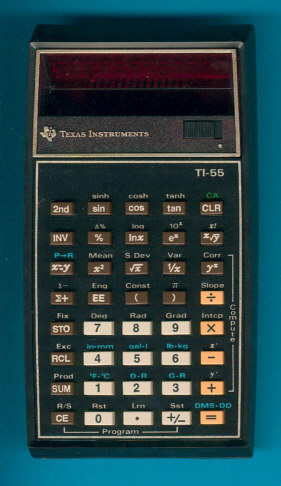 The TI-55 is a programmable calculator first manufactured by Texas Instruments in 1977. It had an LED display, and weighed 6.4 ounces (180 grams). It was programmable to hold up to 32 key-codes that would allow the user to repeat simple calculations with different values.