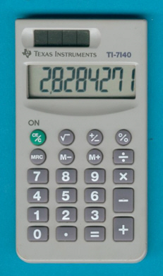 The Texas Instruments TI-7140 is an arithmetic calculator with 8 digits precision and algebraic logic. It has 7 functions, 23 keys and an LCD (liquid crystal) display. The power source is Solar. The calculator was manufactured in USA.