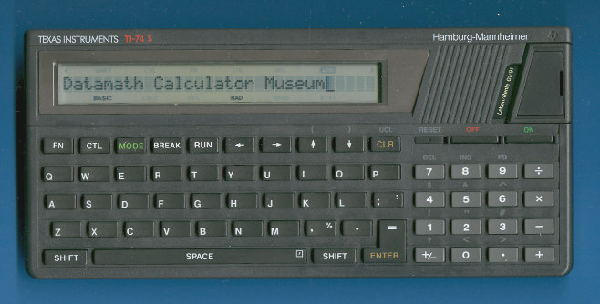 A special OEM version of the TI-74 Basicalc. This one was sold to the German assurance company Hamburg-Mannheimer and usually used together with the PC-324 battery operated printer.