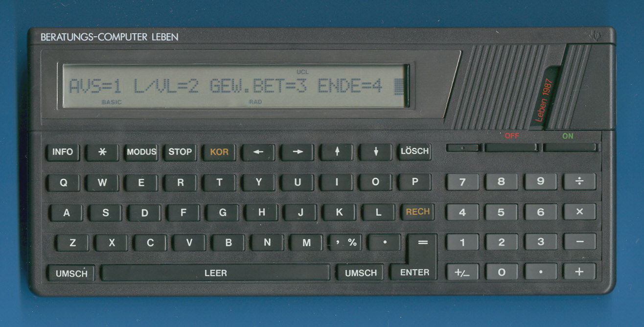 A special OEM version of the TI-74 Basicalc. This one was sold to the German assurance company Allianz.At first glance this TI-74S ALLIANZ looks like one of the different TI-74S variations introduced between 1986 and about 1989 but it is different.
