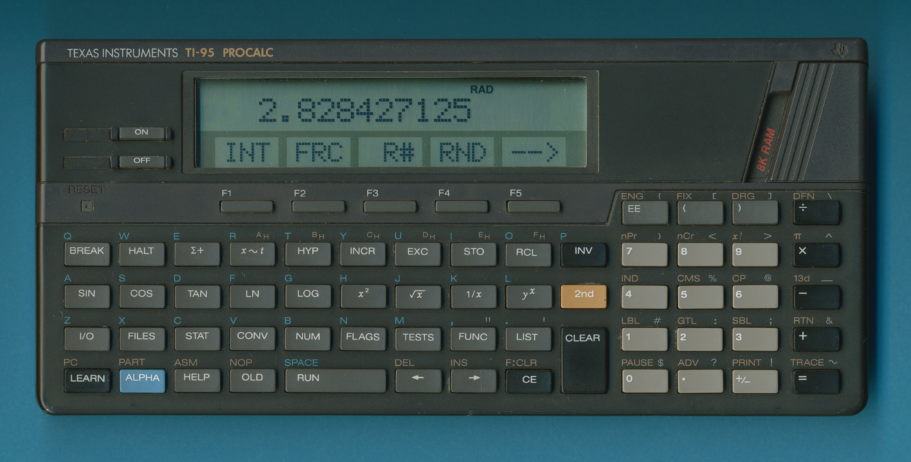 The TI-95, also called the TI-95 Procalc, is a keystroke programmable calculator and was introduced in 1987 by Texas Instruments. It was rather large, measuring 3.7" by 8" by 1" and had a dot-matrix display. It had 8kB of RAM and could be connected to PC-324 compatible printers. Compatible ROM and extra RAM could be placed in the expansion slot at the upper right corner of the device. The compatible ROM were labeled Mathematics, Statistics, and Chemistry, indicating their respective applications.