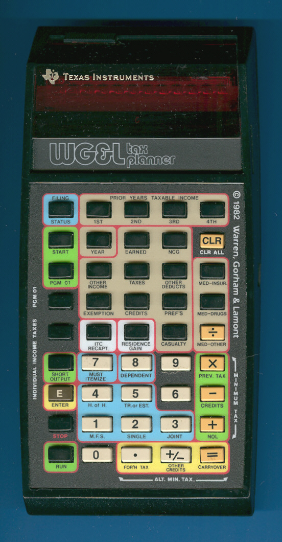 The tax planner application was developed in 1982 by Warren, Gorham & Lamont, Valhalla NY (WG&L) and programmed by Texas Instruments into a Solid State Software Module.