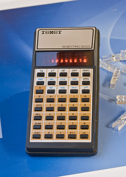 The Texet 2001 SCIENTIFIC is a scientific calculator with 8 digits precision and algebraic logic. It has 30 functions, 40 keys and an LED (light-emitting diode) display, typical of calculators of this era. The power source is PP3 9V.