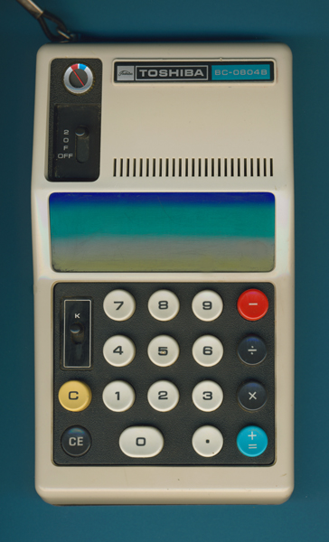 The Toshiba BC-0804B is an arithmetic calculator with 8 digits precision and algebraic logic. It has 4 functions, 17 keys and a VFD (vacuum fluorescent) display. The power source is 5xAA batteries.