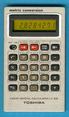 This Toshiba LC-838 started a long line of Metric Converter calculators based on Integrated Circuits (IC's) developed by Toshiba.