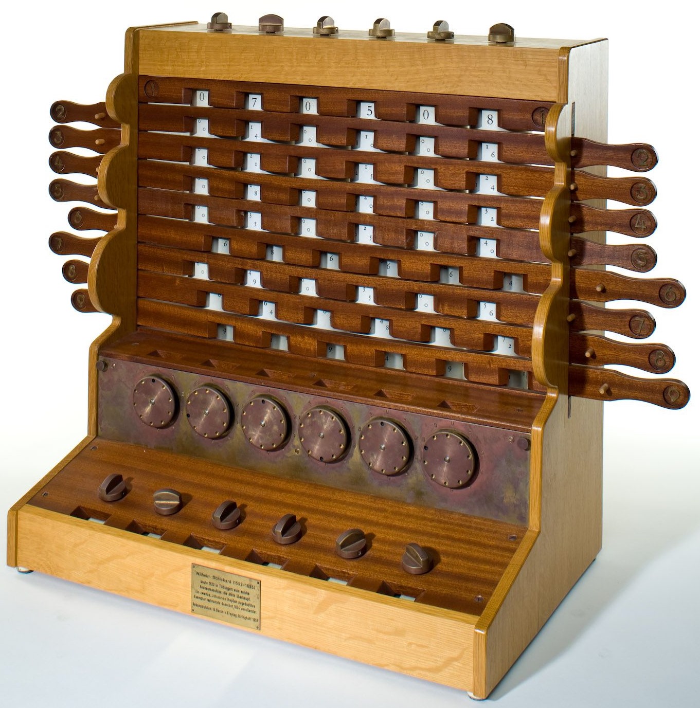 Schickard’s calculating clock (1623). The “calculating clock” of Wilhelm Schickard is considered to be the first mechanical calculating machine. It comprises two separate sections, an arithmetic unit for addition and subtraction (below) and cylinders for multiplication and division (above) that func-tion similarly to Napier’s bones. The six rotating knobs (at the top) serve for inputting up to 6-place multiplicands. The six (vertically mounted) dials (below) acquire the values for the addition and subtraction mechanism. The numerals are represented by counter wheels (© Deutsches Technikmuseum, Berlin).
