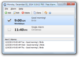 If you need alarm clock software for Windows, this is the software you are looking for. Free Alarm Clock supports unlimited number of alarms so that you are not restricted to the number of alarms you can have. Alarms that you set will sound even if computer goes to sleep. While your PC is sleeping and the time comes to activate your alarm, Free Alarm Clock will wake your PC up. The alarm clock can remind you about important events by playing your favorite music and showing a notification message. You can set alarm volume level to a comfortable level depending on the time of the day.