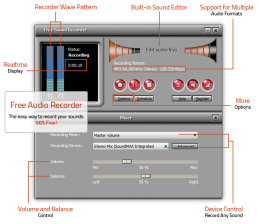 Free Sound Recorder does exactly as it sounds--it is an easy-to-use software program that lets you record any sounds from your sound card and save the recording directly into MP3, WMA or WAV files. Free Sound Recorder is a perfect audio recorder to record your own voice, music or any other sound by working directly with your sound card. It supports the record input/source from a microphone, streaming audio from the Internet, external input devices (CDs, LP, music cassettes, phone line) as well as other applications like Winamp, Media Player. With built-in advanced audio record engine, the recorder produces high quality recordings.