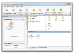 DAEMON Tools Pro is a virtual DVD-ROM emulator based on a SCSI miniport driver. It emulates max. 36 DVD-ROM drives and works with CD/DVD images created by many burning programs. It is great on notebooks without a physical CD-/DVD-ROM drive or to save akku power and speed up CD/DVD access. In opposite to other CD-/DVD-ROM emulators DAEMON Tools Pro doesn't use a proprietary container format. The advantage is that you can burn the images you're using with DAEMON Tools Pro right away or just test an image before burning it to see if it was created correctly. DAEMON Tools Pro works with most image formats. Moreover it has a special feature to make physical (burned) backups of your CD / DVD images when it is possible. It supports Alcohol120%-Images (MDS-Files) and RMPS-Media. It's also great if you want save Power on your Notebook.