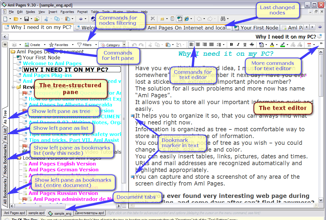 Aml Pages is tree-structured notes organizer for Windows. It contains all your notes, information, web pages, passwords, URL-address in the form of a tree, so you can quickly find what you need. The Aml Pages can easily save web pages (or fragments) from the Internet and provides a sticky for quick notes. Manage megatons of your notes with ease at work and at home.