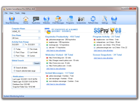 Are you a concerned parent in need of parental control software to monitor your children online or an employer who needs to restrict employee computer usage? SSPro is the award winning all-in-one computer monitoring software product that has become an essential tool for concerned parents and network administrators. SSPro will log keystrokes typed - keylogger, monitor applications run, track websites visited, record instant message conversations and capture screenshots of the computer desktop. Logged data is neatly organized by machine name and date and is displayed with the current Windows login as well as the corresponding time of activity.