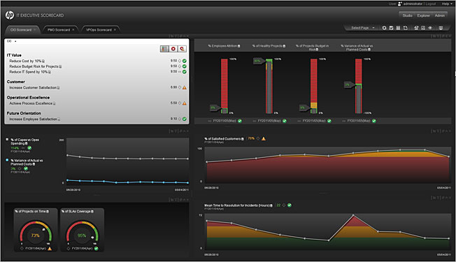 HP IT Executive Scorecard gathers metrics from IT systems to build key performance indicators. It provides scorecards and dashboards for senior management to show them insights in business-friendly formats that can help to convey IT as a valuable business partner. Before the Scorecard, IT tried to pull together reports using manual processes that were slow, difficult, and with little or no governance. The HP IT Executive Scorecard automates gathering information from diverse sources, consolidating it, linking it to a service hierarchy, and presenting it in near real time.