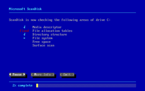 Microsoft ScanDisk (also called ScanDisk), is a diagnostic utility included in MS-DOS and Windows 9x. It checks and repairs file systems errors on a disk drive. It was first introduced in MS-DOS 6.2 and succeeded its simpler predecessor, CHKDSK.