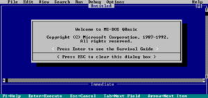 QBasic is an IDE and interpreter for a variant of the BASIC programming language which is based on QuickBASIC. Code entered into the IDE is compiled to an intermediate form, and this intermediate form is immediately interpreted on demand within the IDE.[1] It can run under nearly all versions of DOS and Windows, or through DOSBox/DOSEMU, on Linux and FreeBSD. For its time, QBasic provided a state-of-the-art IDE, including a debugger with features such as on-the-fly expression evaluation and code modification.