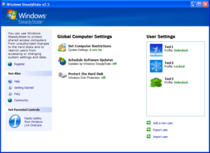Windows SteadyState (formerly Shared Computer Toolkit) is a discontinued freeware tool developed by Microsoft that gives administrators enhanced options for configuring shared computers, such as hard drive protection and advanced user management. It is primarily designed for use on computers shared by many people, such as internet cafes, schools, libraries, etc.