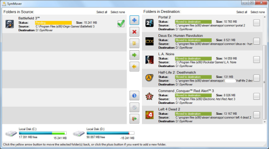 SymMover helps you move a folder from one disk to another, and keep its "location" in Windows Explorer. Windows still "thinks" the folder is located in the same place as before, even though it's not. SymMover achieves this by first moving the folder to its destination, and then creating a symbolic link between the source and destination. This means that software and games will still work after you move them to another disk. SymMover is designed for moving software and games. You can easily add installed software and games to SymMover's main window, and move them back and forth between disks. Do you have a fast SSD, that can't hold all your software and games at the same time? SymMover makes it easy to shuffle your software back and forth between the SSD and other disks. This means that you can benefit from the speed of the SSD, by moving the software you use the most to the SSD. Any disk can run out of space, and SymMover saves you from the hassle of uninstalling your software, and reinstalling it on another disk.