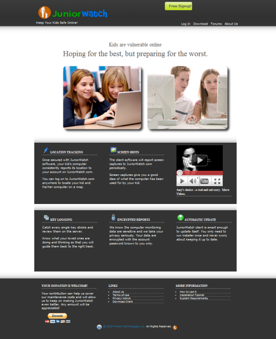 JuniorWatch you may have the peace of mind. You will sure your kids are safe. After you sign up the service, and install the client software on your juniors computer, the client software will consistently report locations, screen and webcam shots, and even key strokes from the computer. You can access the reports from any computer. With all the information you will be able to know what your kids is doing and thinking. If something is not right, you will be able to prevent it from getting worse.