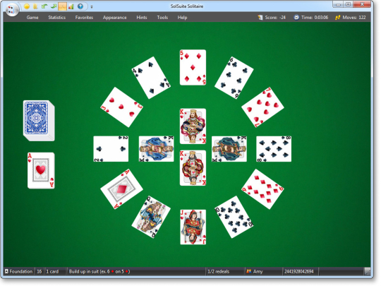 SolSuite Solitaire 2012 is a high-quality collection of 541 solitaire card games, featuring animated and custom cards, dozens of backgrounds, automatic play, high scores, and sounds. All of your favorite games are included, such as Spider, Klondike, FreeCell, Pyramid, Golf, Canfield, Forty Thieves, Flower Garden, and the original Solitaires that you cannot find elsewhere, such as King of Scotland, Baccarat Solitaire, and Mayflower. Its features include a create-a-new-card-set wizard, a multiplayer mode, a rules wizard and a tutor. SolSuite 2012 includes more than 80 awesome card sets, more than 300 beautiful card backs, more than 100 backgrounds, Large Card Sets easier to see, lot of advanced features, options and statistics.