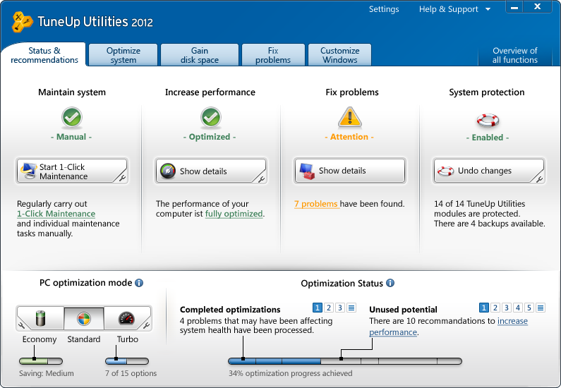 The easy and complete all-round PC optimization workout. More than 30 tools guarantee PCs maintain peak performance when working, playing, and gaming. Even when not needed, background processes, services, and scheduled tasks will often be running. With the new TuneUp Program Deactivator, you can turn off programs on demand, completely automatically, thus reducing the demands on your PC. The result: that "Windows like it was on the very first day" feeling. The brand-new Economy Mode offers extra mobility--just with the click of a button. It extends battery run-time on notebooks, netbooks and tablet PCs running Windows by up to 30%, while also reducing energy consumption by up to 30%. And it even optimizes power management under Windows.